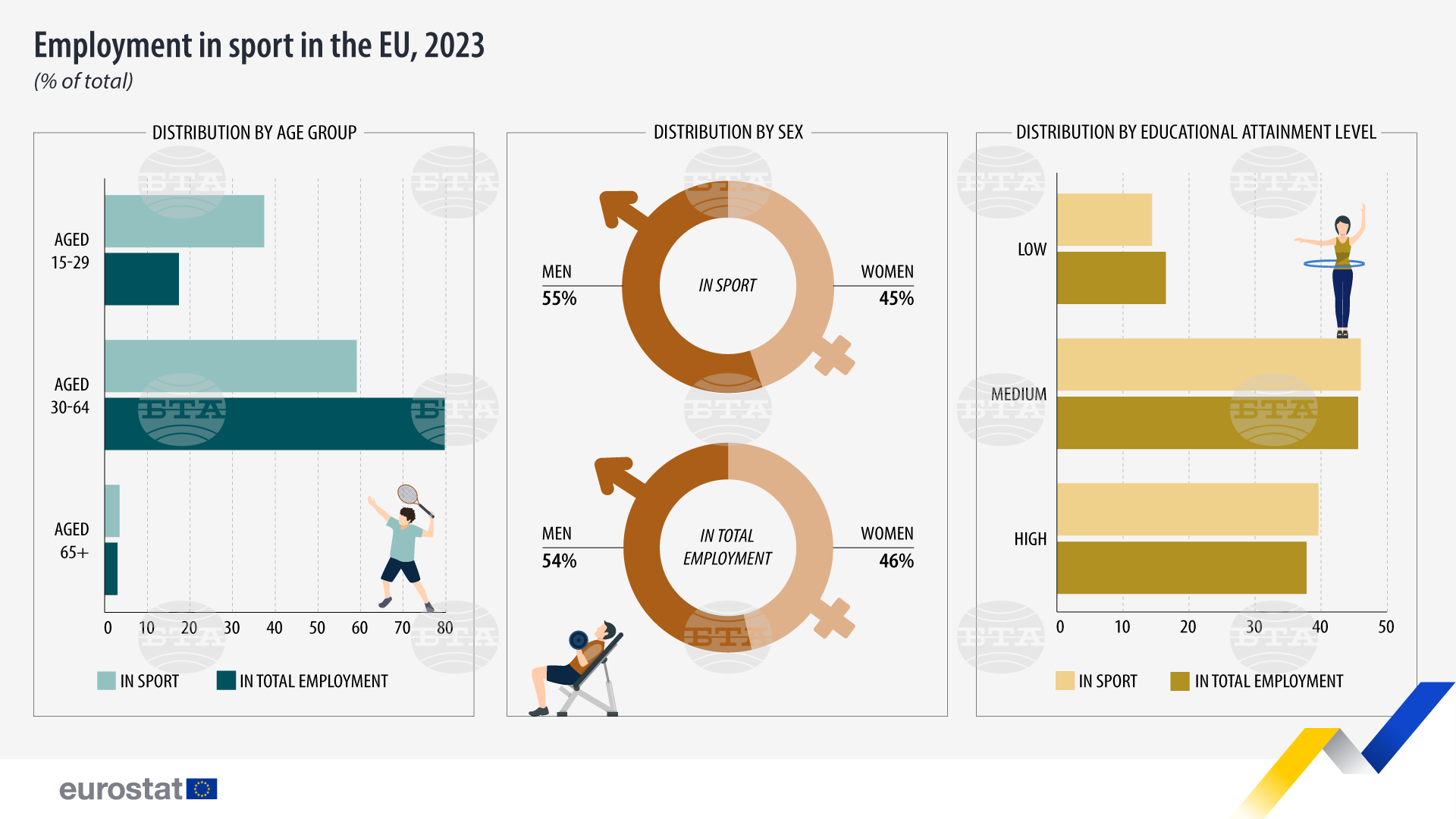 През 2023 година 1,55 милиона души са били заети в спортния бранш в Европейски Съюз, което е 0,76 на 100 от общата претовареност, регистрира Евростат. Спрямо 2022 година (1,51 милиона души) броят на хората, работещи в бранша на спорта, е повишен с 2,2 на 100.
