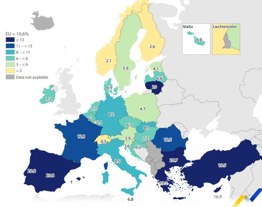 По-голям % е регистриран само в Испания и Португалия (по 20,8% във всяка страна), като след нашата страна са Литва (с 20%) и Гърция (с 19,2%).