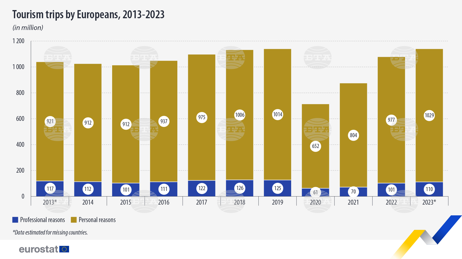 През 2023 година жителите на страни от Европейския съюз са осъществили 1,14 милиарда туристически пътувания с най-малко 1 нощувка. Това съставлява растеж с 5,7 на 100, отговарящ на покачване на броя на туристическите пътувания с 61,6 милиона, на годишна база, демонстрират най-новите данни на Евростат, оповестени през днешния ден на страницата на статистическата организация.