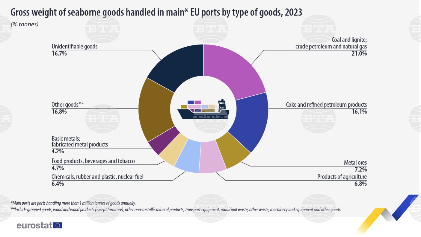 Най-големият дял от стоките, обработени от главните пристанища на Европейски Съюз през 2023 година, се е състоял от въглища и лигнит, необработен нефт и природен газ - 21 на 100. Следват коксът и петролните артикули, които са представлявали 16,1 на 100 от общия размер. Металните руди и други артикули от минното дело и кариерите са съставлявали 7,2 на 100, до момента в който продуктите от селското, ловното, горското и рибното стопанство - 6,8 на 100, от товарите през главните пристанища на Европейски Съюз. Химикалите, каучукът, пластмасите и нуклеарното гориво общо са отговаряли на 6,4 на 100 от тези товари, до момента в който питателните артикули, напитките и тютюнът са били 4,7 на 100.