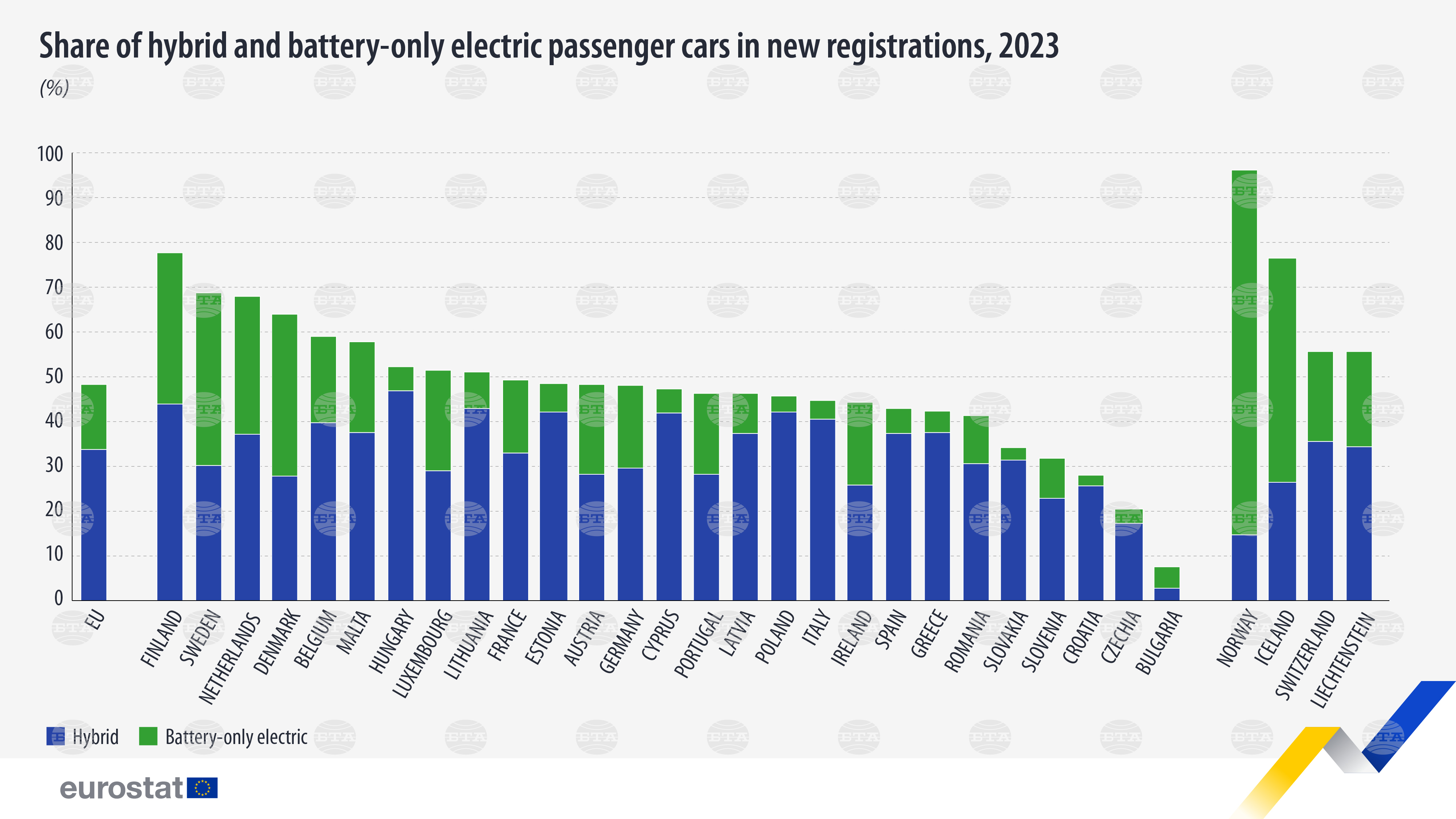 В девет страни членки на Европейски Съюз делът на хибридите и електрическите автомобили през 2023 година надвишава 50 на 100 измежду новите регистрации. Най-висок е той във Финландия - 78 на 100, като 44 на 100 от тях са хибриди, а 34 на 100 - електрически. В класацията следва Швеция с дял от 69 на 100 (30 на 100 хибриди и 39 на 100 електрически) и Нидерландия - 68 на 100 (37 на 100 хибриди и 31 на 100 електрически).