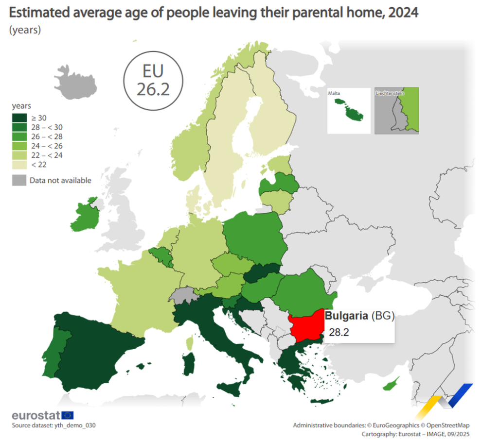 През 2024 година младежите в Европейски Съюз са напуснали дома на родителите си на междинна възраст от 26,2 години , което е лек спад спрямо 26,3 години през миналата година, регистрира Евростат. От 2002 година насам тази междинна възраст се колебае леко сред най-ниската регистрирана междинна възраст - 26,1 години през 2019 година и най-високата - 26,8 години през 2006 г