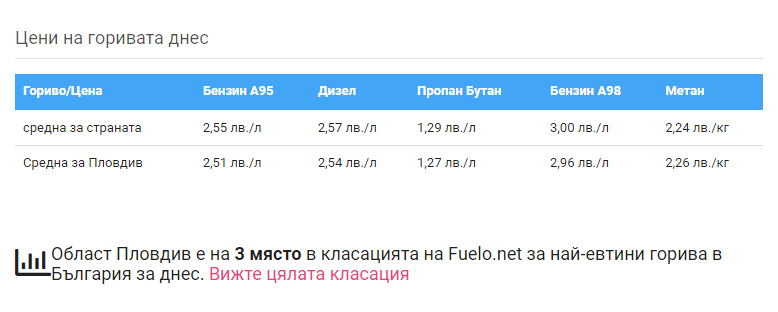 Регионалните разлики в цените на горивата също са фактор за потребителите, като и през тази година Пловдив беше от областите с най-ниски цени. Традиционно под тепетата, в Русе, Велико Търново и Перник цените са най-ниски, с към 3-5 стотинки под междинното за страната. В същото време зареждането в области като Кърджали, Разград, Смолян и Добрич излиза доста по-скъпо, отбелязвайки разлики до 5% над междинните стойности.