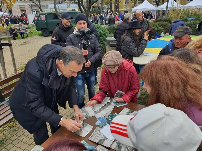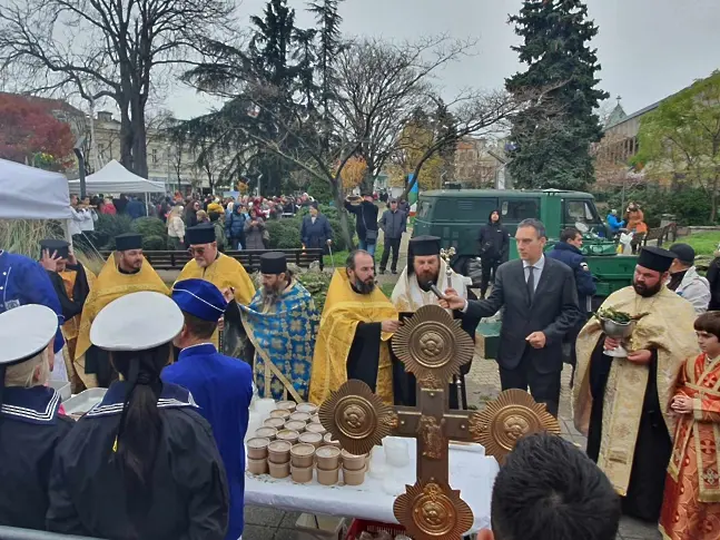 Веднага по-късно стартира и раздаването на рибния курбан за бургазлии, а градоначалникът се включи в празничната стратегия, като зае своето място на кметското бюро в градинката до Часовника и стартира да подписва и раздава на бургазлии празнични картички и никулденската брошура с достоверни рибни предписания.