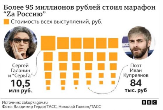 Би Би Си съпоставя разноските за присъединяване на актьори по държавни контракти в Маратон и други концерти, в това число и през предходни години. Тези калкулации са приблизителни, защото всички условия не са изцяло оповестени, само че могат да дадат визия за цените. Оказва се, че в изискванията на актуалната рецесия турнето в поддръжка на " специфичната интервенция " в Украйна не е неприятен бизнес за патриотично настроените актьори.