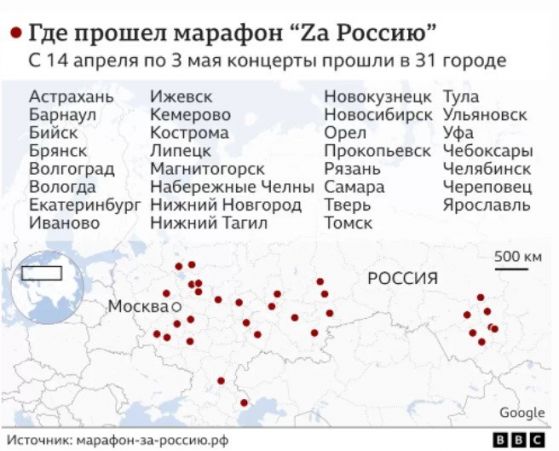 През април и началото на май в съветските райони се организира маратонът " Zа Русия ". Властите похарчиха за него рекордната сума от близо 100 млн. рубли. Изпълнителите получават огромни възнаграждения от патриотичните концерти и са поканени от Експертния институт за обществени проучвания, който се намира наоколо до Кремъл.