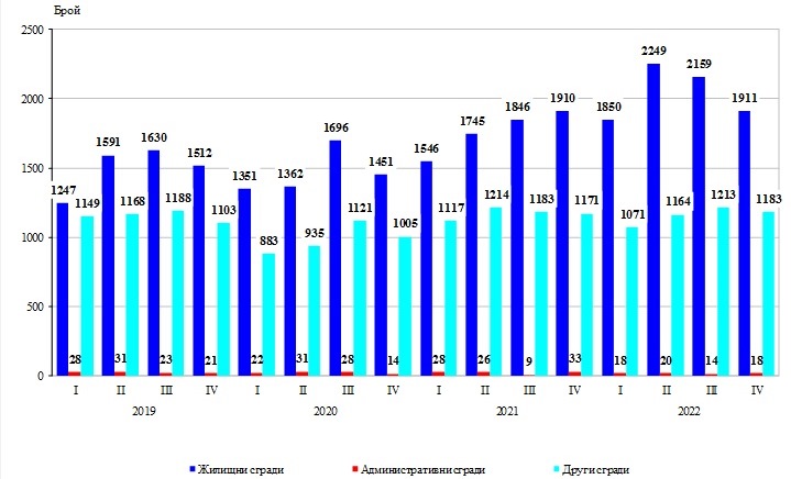 През четвъртото тримесечие на 2022 година локалните администрации са издали на 1 911 жилищни здания с 10 203 жилища в тях и 1 131 176 кв. м разгъната застроена повърхност (РЗП), на 18 административни сгради/офиси със 17 683 кв. м РЗП и на 1 183 други здания с 534 969 кв. м РЗП.