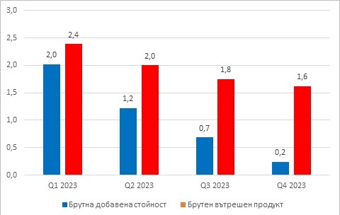 През четвъртото тримесечие на 2023 година Брутният вътрешен продукт се усилва с 1,6% по отношение на четвъртото тримесечие на миналата година, а брутната добавена стойност нараства с 0,2%.