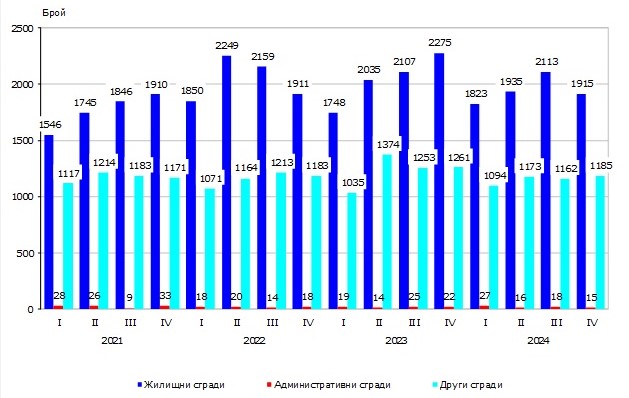 През четвъртото тримесечие на 2024 година локалните администрации са издали на 1915 жилищни здания с 9 861 жилища в тях и с 1 103580 кв. м разгъната застроена повърхност (РЗП), на 15 административни сгради/офиси с 34 929 кв. м РЗП, както и на 1 185 други здания с 628133 кв. м РЗП.