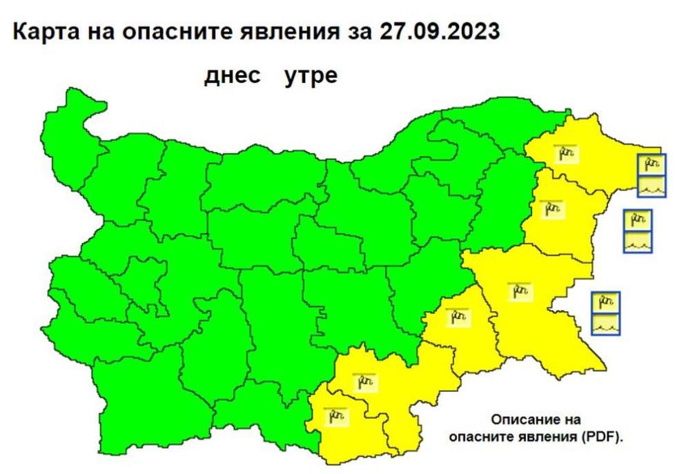 По Черноморието ще доминира слънчево време, тук-там в утринните часове ще има ниска облачност или мъгла. Ще духа сдържан и мощен североизточен вятър. Максималните температури ще са 25°-26°. Температурата на морската вода е 23°-25°. Вълнението на морето ще бъде 3-4 бала.