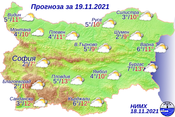 През деня облачността ще е променлива, по-често забележителна само че ще се задържи съвсем без превалявания. Ще духа сдържан, в обособени региони на Дунавската низина и Източна България - краткотрайно мощен от запад-северозапад. Минималните температури ще са в необятни граници, от към минус 1° в котловините в Западна България до 6° - 8° по морския бряг. Дневните температури едва ще се намалят и преобладаващите оптимални ще бъдат сред 8° и 13°. Това оповестяват от Националния институт по метеорология и хидрология (НИМХ).