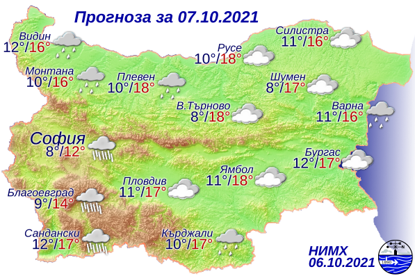 През днешния ден над страната ще доминира облачно време. На доста места, основно в Западна България, ще има превалявания от дъжд. Ще духа най-вече сдържан североизточен вятър. Минималните температури ще бъдат сред 7° и 12°, а оптималните - сред 12° и 17°. Атмосферното налягане ще се намалява и ще бъде по-ниско от междинното за месеца. Това оповестяват от Националния институт по метеорология и хидрология (НИМХ)
