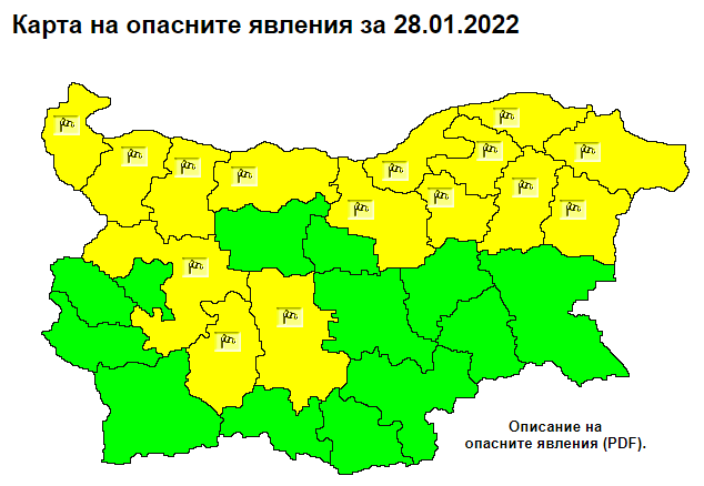 Жълт код е разгласен в 15 области на страната поради мощния вятър. Това са областите Видинска, Монтанска, Врачанска, Плевенска, Софийска, Пазарджишка, Пловдивска, Великотърновска, Русенска, Търговищка, Разградска, Силистренска, Шуменска, Добричка и Варненска.