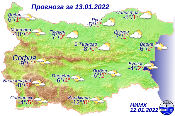 Сутринта ще е студено, с минимални температури сред минус 9 и минус 4 градуса, в обособени региони до минус 10 - минус 12, в - към минус 9 градуса.