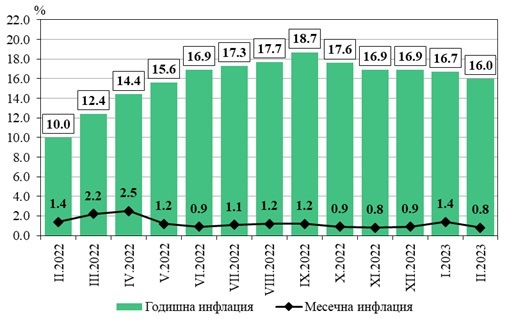 През февруари 2023 година месечната инфлация е 0,8% по отношение на предходния месец, а годишната инфлация за февруари 2023 година по отношение на февруари 2022 година е 16,0%.