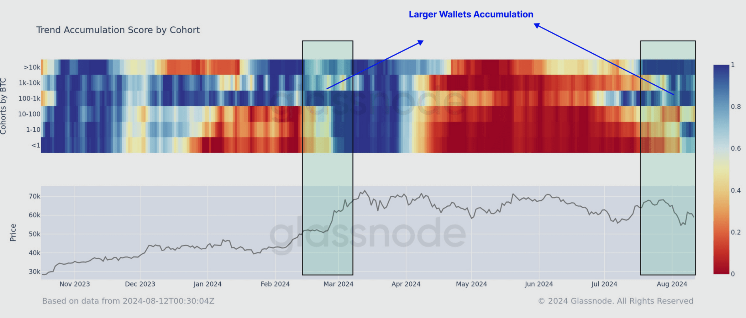 През последните седмици обаче се следят ранни признаци на поврат, изключително измежду портфейлите с максимален размер, които постоянно са свързани с институционални вложители като ETF-и. Изглежда, че тези огромни портфейли се изместват назад към акумулация.