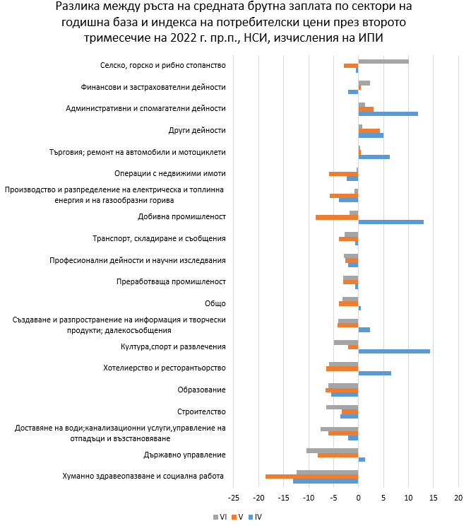 През миналите месеци в центъра на икономическия спор застана растежа на цените, и с право – България не е виждала покачвания на показателя на потребителските цени от над 10% на годишна база от десетилетия. Това повдига въпроса дали динамичността на заплатите и приходите на семействата изпреварват растежа на цените, или в противен случай – очевидци сме на действително обедняване. Публикуваните тази седмица данни за заплатите през второто тримесечие на 2022 година разрешават да създадем такова съпоставяне, а резултатите са мотив за терзание, защото инфлацията надвишава растежа на заплатите в съвсем всички стопански действия. На първо място, доста огромните разлики в заплатите сред обособените стопански действия в страната остават, като най-високи са те през второто тримесечие в ИКТ бранша (4206 лв. брутно месечно), а най-ниски – в бранша на хотелите и заведенията за хранене (1058 лева). На тримесечна база междинната заплата за страната е повишена със 125 лв., до бруто 1730 лв., а множеството браншове на стопанската система се групират близо и под междинната стойност. За да оценим дали растежа на заплатите надвишава този на инфлацията, съпоставяме динамичността на междинната брутна месечна заплата на годишна база през последните три месеца, за които има данни (май, юни и юли 2022 г.) с тази на изменението на показателя на потребителски цени на годишна база за същите месеци. Разликата сред смяната в двата знака разрешава да оценим дали налице е действително обедняване, най-малко при приходите на работещите.