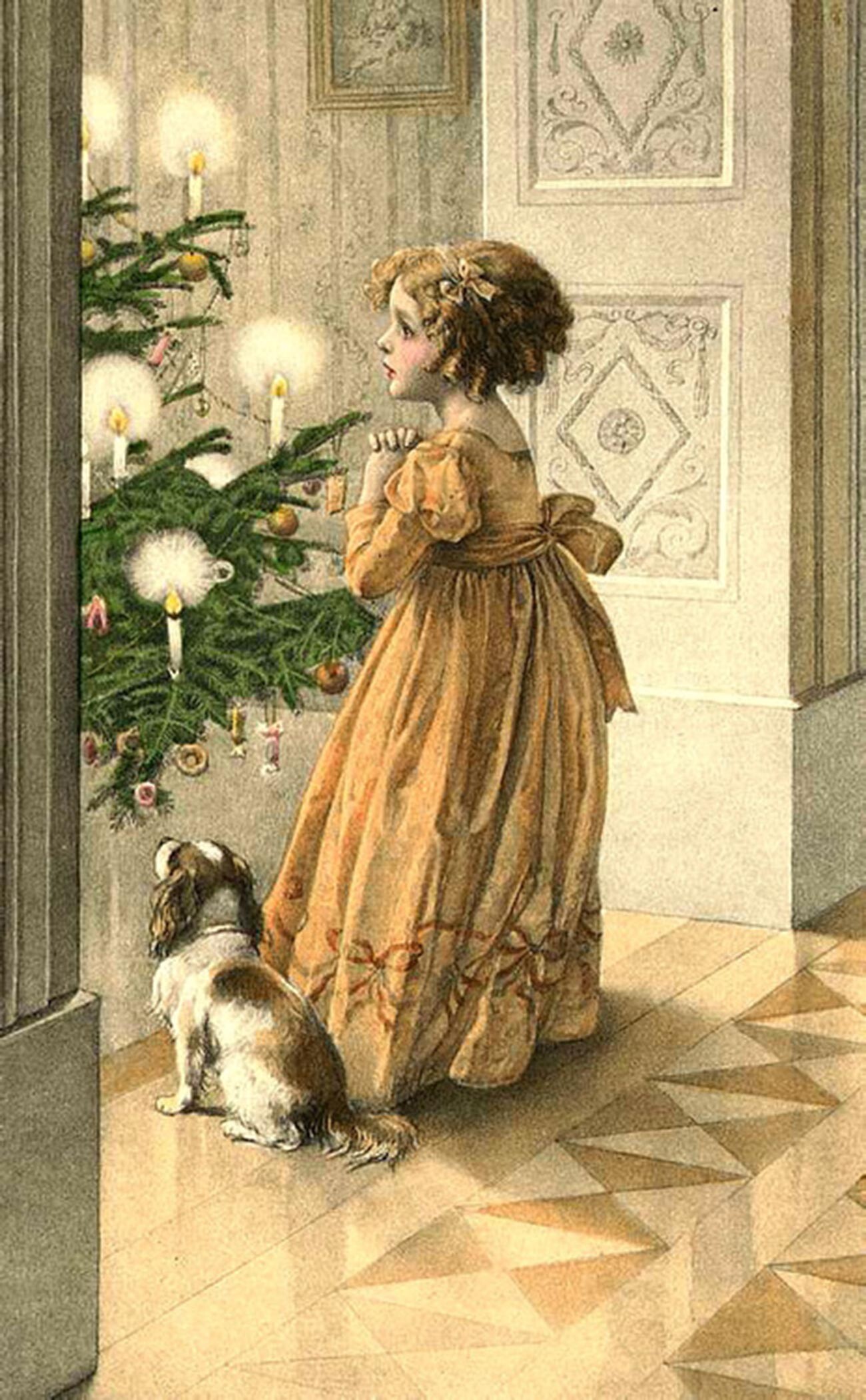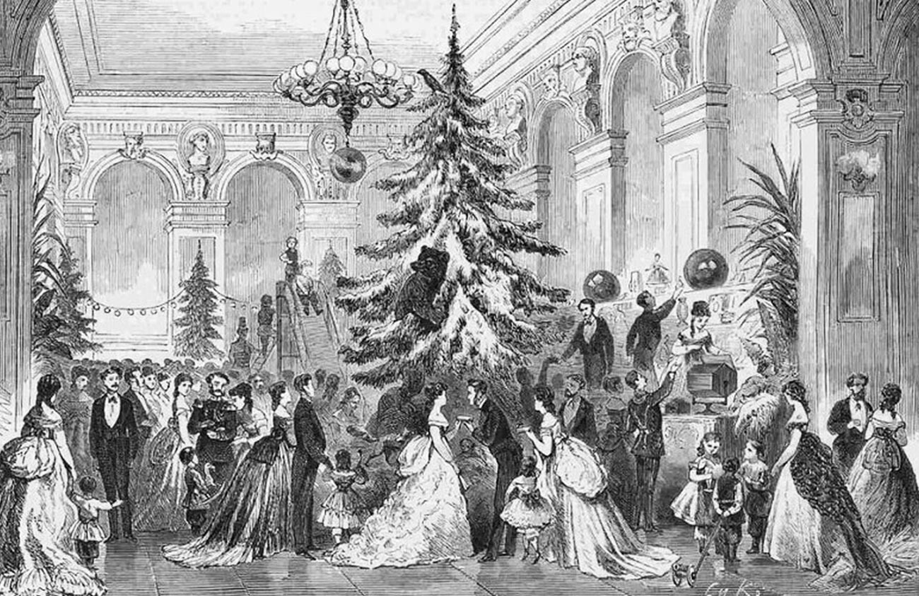 Най-накрая звъни камбанка. „ От неспокойствие съвсем имахме спазми “, разказва този миг 12-годишният популярен княз Константин Николаевич. Нищо чудно. Камбанката в действителност е сигнал да се пуснат децата в стаята, която е осветена от „ хиляда свещи “. Там императрицата извежда малчуганите един по един на обособени маси с коледни елхи, които са украсени със сладкиши и плодове, и им раздава дарове.