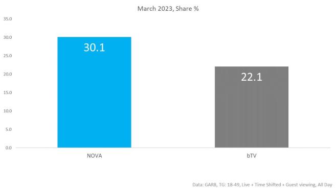 През м. март 2023 година NOVA бележи рекорден резултат в своята история. Официалните пийпълметричните данни регистрират среднодневен аудиторен дял от над 30% измежду аудиторията в дейна възраст (18-49). До момента това е най-високата стойност за NOVA, регистрирана от пийпълметрична система от 2005 година до през днешния ден.