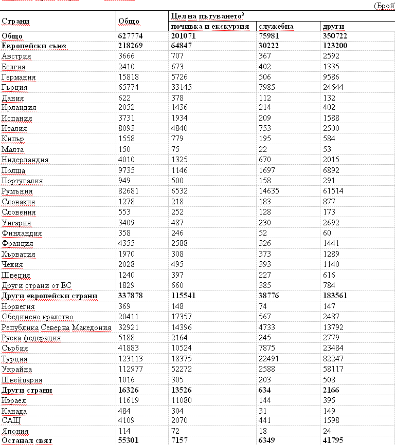 От общия брой чужденци, посетили България през март 2022 година, делът на жителите от Европейския съюз е 34.8%, или 218.3 хиляди, като максимален е броят на визитите на жители от Румъния - 37.9% и Гърция - 30.1%.