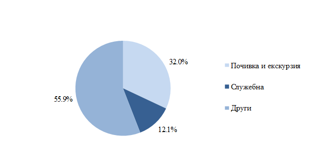 През март 2022 година относителният дял на визитите по цел е, както следва: с други цели - 55.9%, за отмора и екскурзия - 32.0%, и със служебна цел - 12.1%.