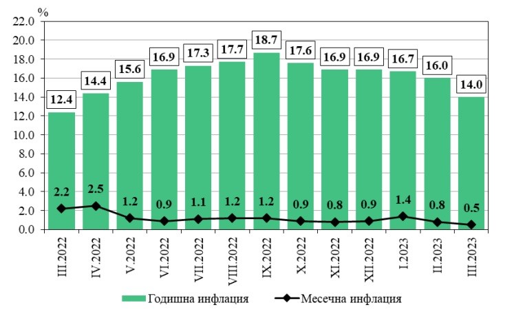 Инфлацията от началото на годината (март 2023 година по отношение на декември 2022 г.) е 2,6%, до момента в който средногодишната инфлация за интервала април 2022 – март 2023 година спрямоаприл 2021 година – март 2022 година е 16,5 на 100.
