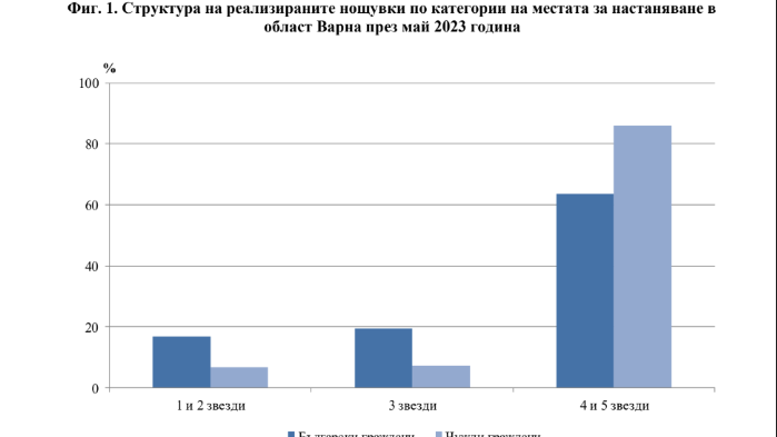 През май 2023 година в хотелите с 4 и 5 звезди са осъществени 86.1% от общия брой нощувки на непознати и 63.6% - на български жители. В местата за настаняване с 3 звезди са осъществени 7.2% от нощувките на непознати и 19.5% - на български жители, до момента в който в 1 и 2 звезди те са надлежно 6.7 и 16.9%.