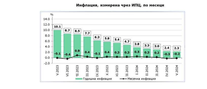 През май 2024 година месечната инфлация е -0.2%, а годишната инфлация за май 2024 година по отношение на май 2023 година е 2.3%, демонстрират данните на Национален статистически институт.