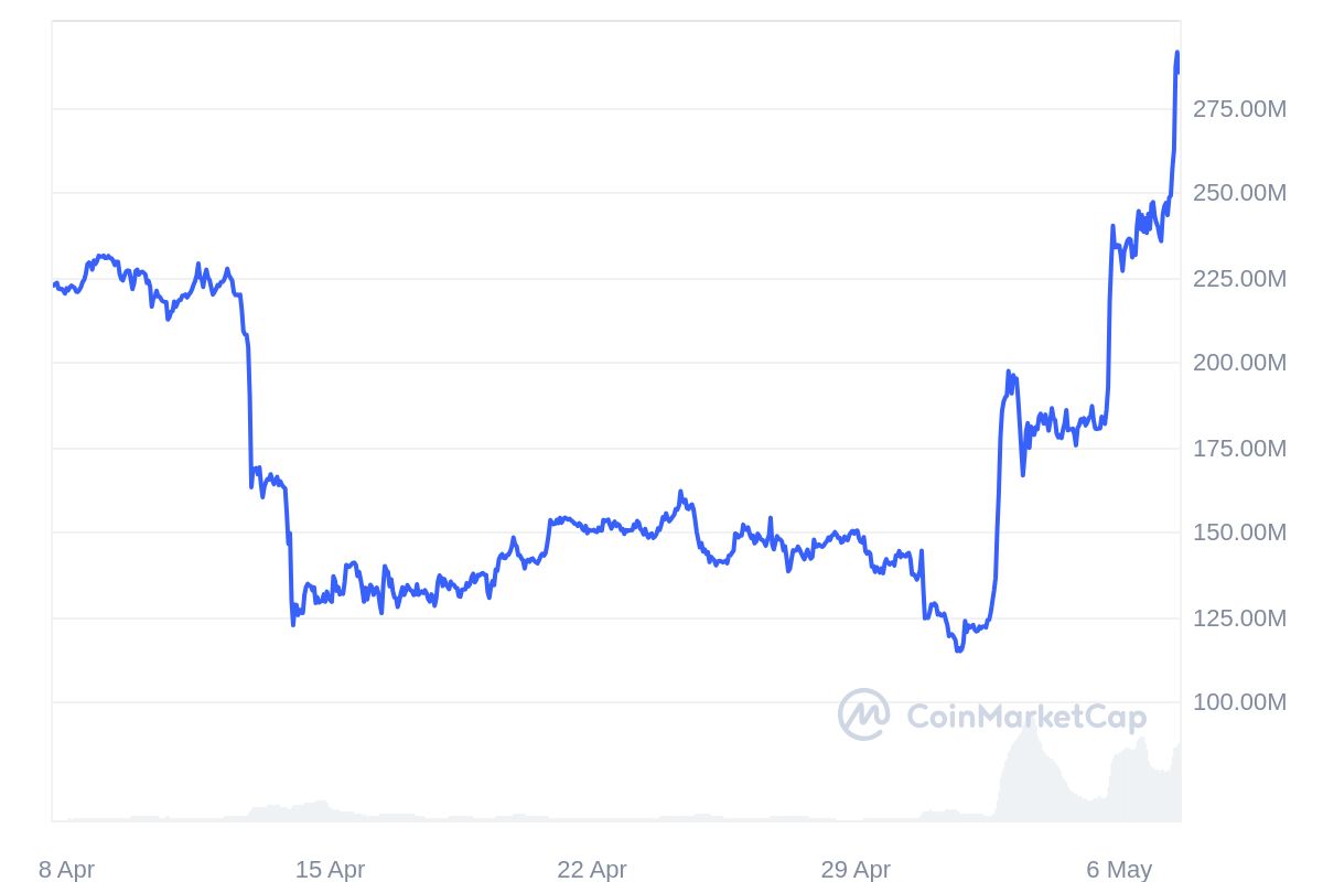 Към 30 април пазарната капитализация на TRB възлизаше на $143.32 милиона. Към момента на писане на публикацията (7 май, 15:00 ч.), тази цифра набъбна впечатляващо до $285 милиона.