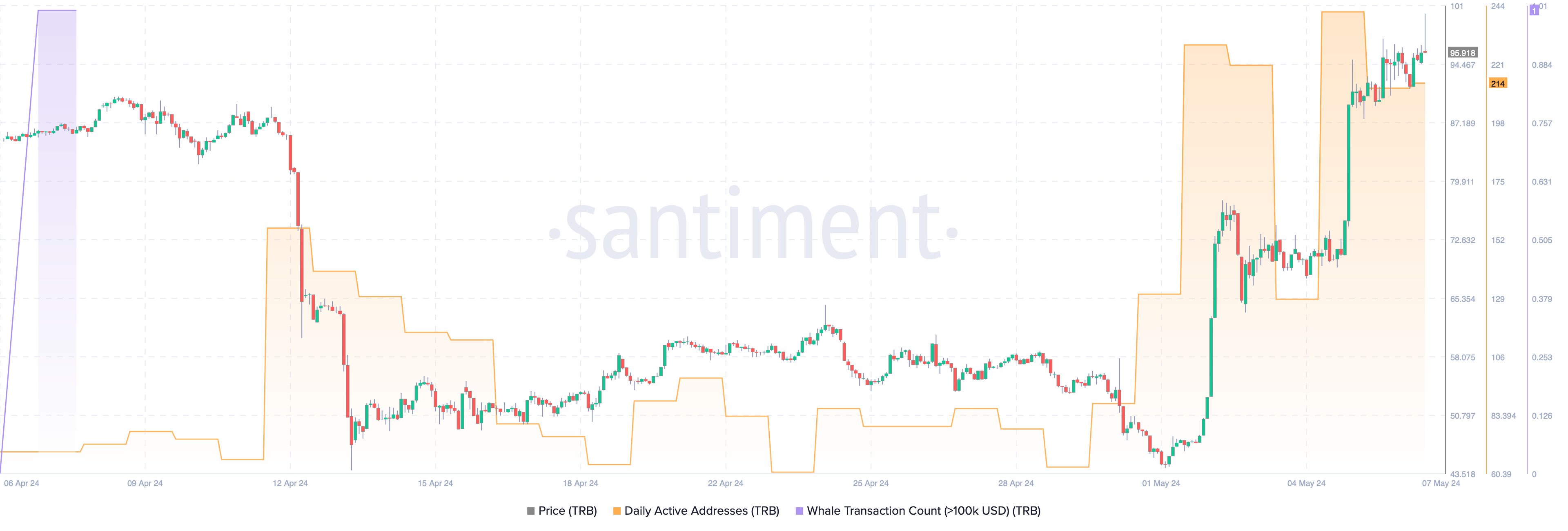 Данните от платформата за блокчейн разбори Santiment разкриха внезапно повишаване на транзакции, подбудени от крипто китовете и дейните адреси, свързани с TRB. По-конкретно, на 6 май е имало 212 дейни адреса на ден, а транзакциите на китовете, надхвърлящи $100,000, бяха общо 16.