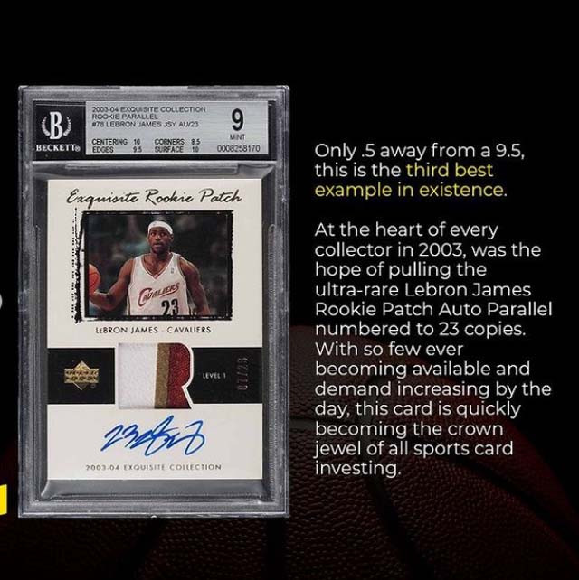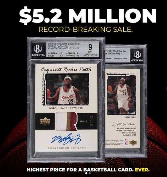 Наскоро от аукционната къща PWCC Marketplace успявят дя пласират един извънредно скъп образец - комерсиална карта 2003-04 Upper Deck Exquisite Collection RPA с подписа на звездата от Лейкърс от времето, когато Леброн към момента е дилетант в баскетбола и още никой не го назовава Краля. От PWCC продават картата на търг за галактическата сума от 5.2 милиона щатски $ и с нея Леброн Джеймс отбелязва не един, а два върха - за най-скъпата комерсиална карта в баскетбола и за най-скъпата карта на новобранец в същия спорт.