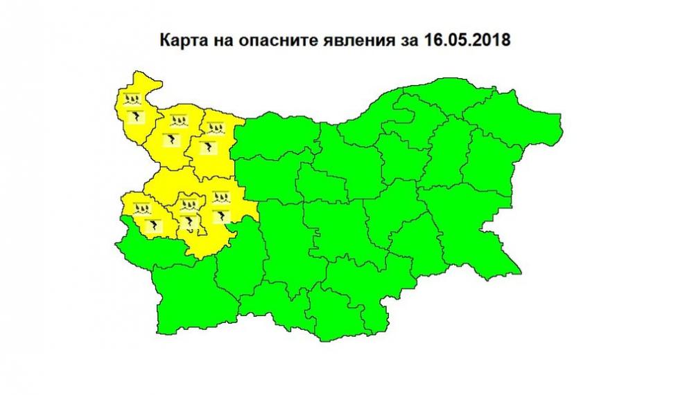 Жълт код е въведен за шест области - Видин, Монтана, Враца, София-област, София град и Перник. В тези региони през нощта против сряда ще има краткотрайни и интензивни превалявания, съпроводени с гръмотевични стихии и градушки. Очакваните количества на преваляванията ще са към и над 30 л/кв.м за 3-6 часа.
