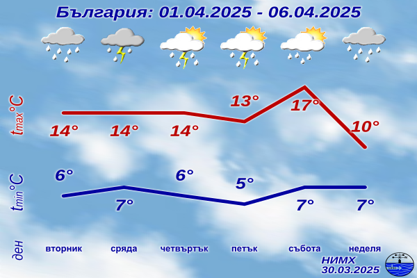 НИМХ обяви седмична прогноза, от понеделник 7 дни наред валежи