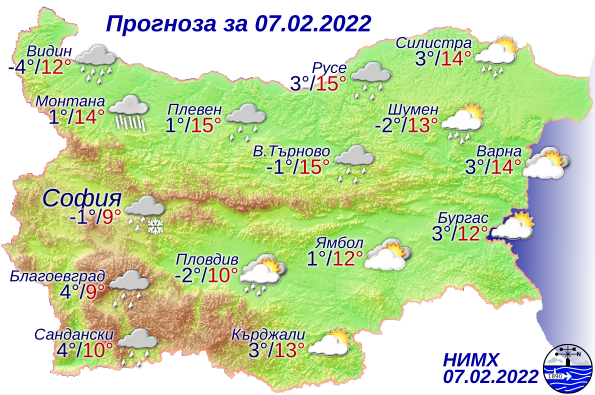 Максималните температури ще бъдат сред 10° и 15°, по-ниски по високите полета на Западна България, в София 7°.
