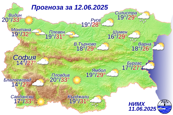 През нощта над страната ще бъде най-вече ясно. Ще е съвсем безшумно, в Дунавската низина със слаб вятър от запад. През деня ще бъде най-вече слънчево, сутринта с купеста облачност в източните региони, а към и след обяд и над Рило-Родопската област. Главно там на изолирани места ще има краткотрайни валежи. Значителни по количество превалявания не се чакат. Вятърът ще е слаб до сдържан, от северозапад, а в източните региони - от изток-североизток. Максималните температури ще са най-вече сред 28° и 33°, по-ниски по Черноморието, а в София - към 27°.