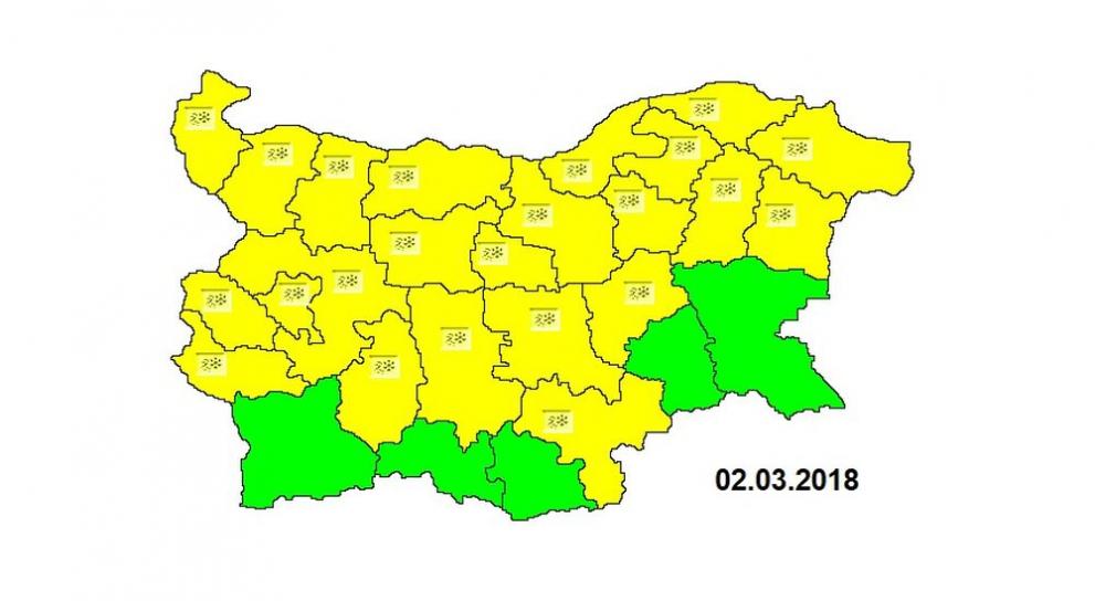 Жълт сигнален код поради вероятни поледици е разгласен в 23 области на страната. Очаква се да има слаби превалявания, изначало от сняг, само че денем, с покачването на температурите, тук-там ще минават в дъжд и ще се образуват поледици.