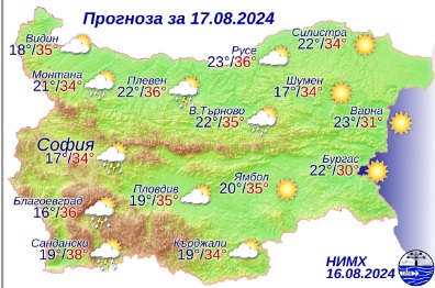 През нощта ще бъде ясно, а на следващия ден преди обяд - най-вече слънчево. Около и след обяд още веднъж над Западна и Централна България ще се развива забележителна купеста и купесто-дъждовна облачност и тук-там, основно в планинските региони и Дунавската низина, ще има краткотрайни превалявания от дъжд, съпроводени с гръмотевици. В Източна България през целия ден ще бъде слънчево. Вятърът ще е слаб, а в източните региони и сдържан от изток-югоизток. Максималните температури ще бъдат сред 32° и 37°, за София - към 34°.