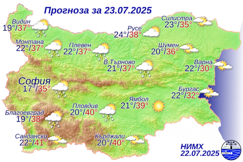 Екипът на Meteo Balkans издаде карта с предизвестия за неприятно време, които са годни за 23 юли 2025г.