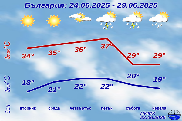 През идващите дни ще се задържи слънчево, след обяд - горещо. Вятърът ще е най-вече слаб, най-често от запад-северозапад. Температурите ще се покачат още, към четвъртък и петък оптималните тук-там ще са до 38° - 40°. В петък по-късно денем и през нощта против събота над страната ще премине леден фронт. Атмосферата ще се лабилизира, ще се развива купеста и купесто-дъждовна облачност и тук-там ще има краткотрайни превалявания, с гръмотевици и краткотрайно увеличаване напразно, ще има условия и за градушки. Вятърът, изначало от северозапад, след това от север-североизток ще се усили и ще нахлува леден въздух. През почивните дни дневните температури ще са с 8-10 градуса по-ниски. В неделя вятърът ще отслабне, преваляванията ще намалеят като обсег и активност.