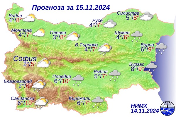 Утре, с увеличаване напразно от северозапад, облачността ще стартира да се раздира и понижава, след обяд в северозападните региони до най-вече слънчево време. Предимно облачно, към момента на обособени места със слаби валежи от дъжд, ще се задържи през по-голямата част от деня в Централна и Източна България. Ще духа сдържан, в западната част на Дунавската низина и краткотрайно мощен северозападен вятър. Максималните температури ще бъдат сред 5° и 10°, в София - към 5°.