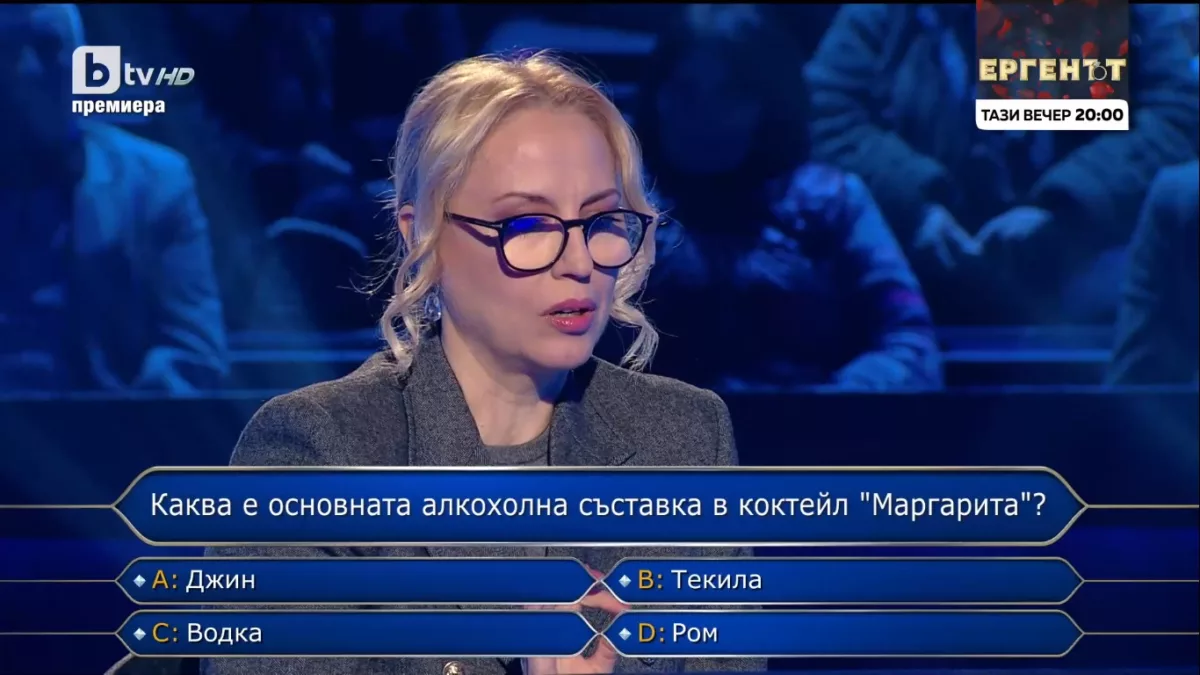 След това тя бе запитана „ Каква е главната алкохолна съставна част в коктейла „ Маргарита “? “ – Джин, Текила, Водка или Ром. Тук тя призна, че се е занимавала с сходен бизнес – основала е ресторант, който още действа. Така тя уточни и тук вярно отговора Текила.