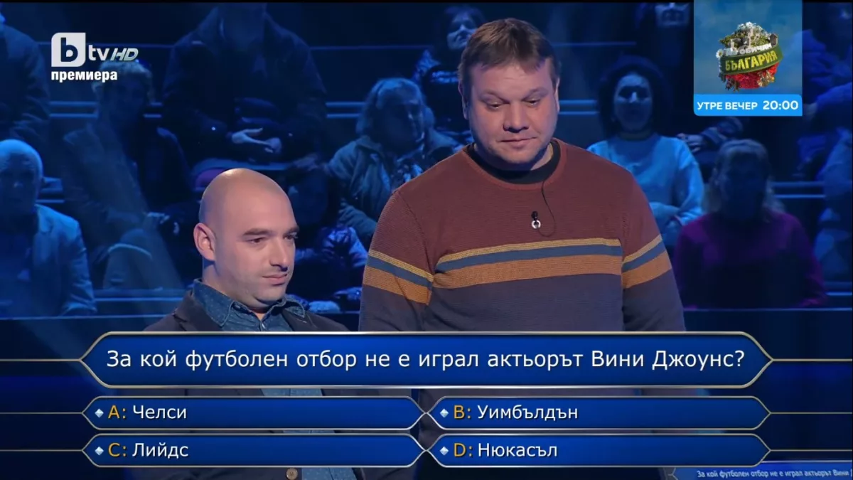„ За кой футболен тим не е играл артистът Вини Джоунс? “, го попита по-късно Ники Кънчев, а вариантите, които му даде, бяха Челси, Уимбълдън, Лийдс и Нюкасъл. Участникът бе съвсем сигурен, че става дума за Челси, само че реши да се посъветва с жокера си от публиката – неговият зет Бисер. Той също го насочи към „ Сините от Лондон “, само че Кънчев ги разочарова, че правилният отговор е Нюкасъл и по този начин обещаващата му игра приключи с 500 лв. и два жокера „ в джоба “.