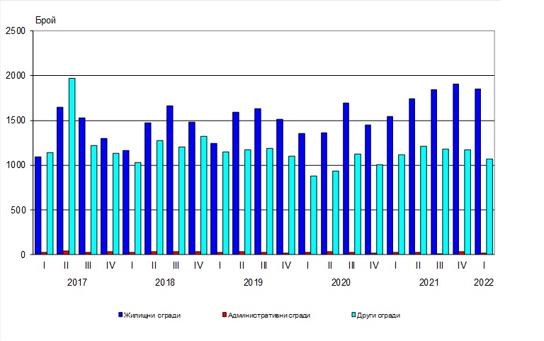 През първото тримесечие на 2022 година локалните администрации са издали разрешителни за градеж на 1 850 жилищни здания с 9489 жилища в тях и 1 171388 кв. м разгъната застроена повърхност (РЗП), на 18 административни сгради/офиси с 16 767 кв. м РЗП и на 1 071други здания с 572703 кв. м РЗП.