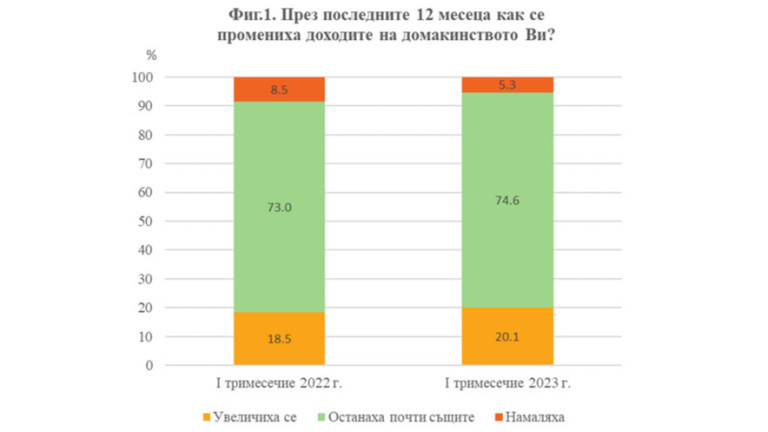 Увеличение на приходите са показали 20.1% от лицата, което е също с 1.6 процентни пункта повече спрямо първото тримесечие на 2022 година, когато нарастване са имали 18.5% от лицата. 5.3% пък са лицата, чиито приходи са намалели през миналите 12 месеца. Това е с 3.2 процентни пункта по-малко по отношение на същото тримесечие на 2022 година.