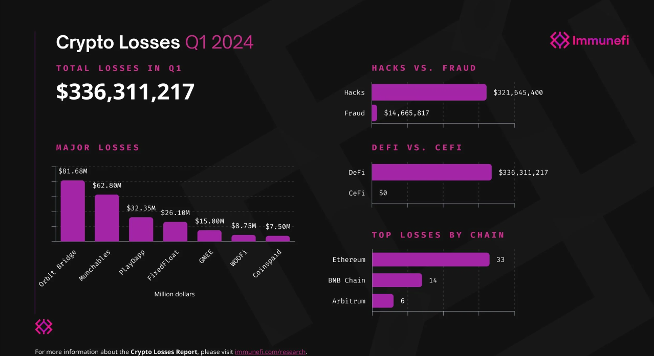 През първото тримесечие на 2024 година в бранша на криптовалутите се следи незабравим спад от 23% на загубите, дължащи се на хакерски и лъжливи действия, спрямо миналата година, както се показва в отчет, оповестен от компанията за блокчейн сигурност Immunefi.