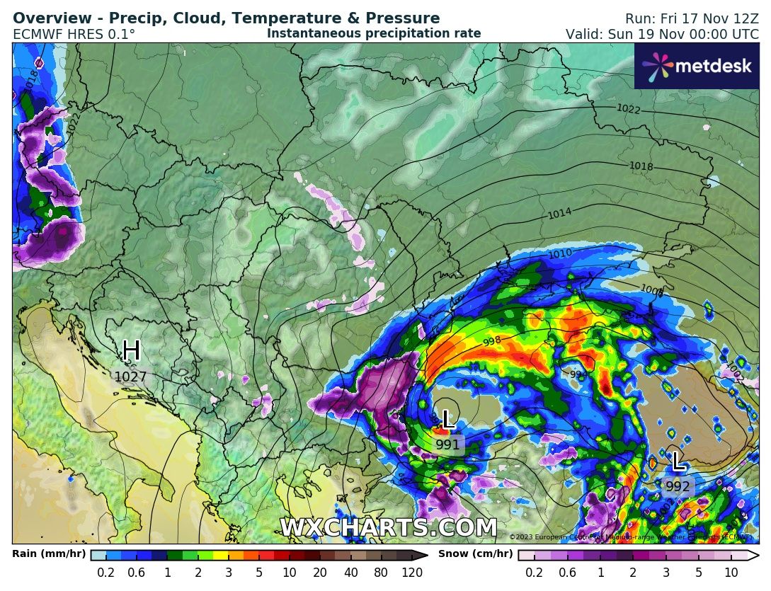 До неделя на обяд циклонът ще се реалокира на безвредно разстояние от България. Критичен миг обаче ще е нощта против неделя, когато преваляванията в Източна България ще са интензивни - количествата ще надминат 50-60 литра на квадратен метър с риск от наводнения. Очакват се и значителни снеговалежи, изключително по планинските пътища и проходи на Централна и Източна Стара планина.