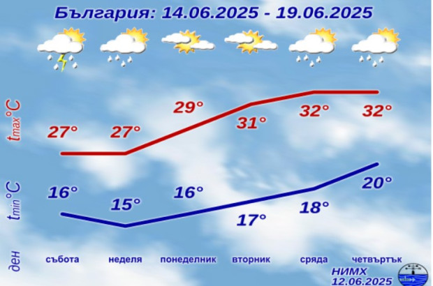В часовете към и след пладне ще се развива купеста облачност, само че единствено на обособени места ще превали временен дъжд. Максималните температури ще бъдат сред 30° и 35°.