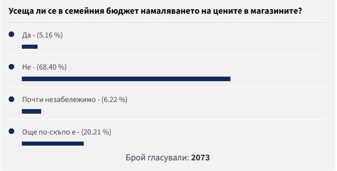 Едва 6 на 100 от присъединилите се в анкетата ни показват, че въпреки и " съвсем незабележимо " има смяна към по-поносими цени. Най-малко респонденти - 5% от интервюираните, са дали отговор, че усещат позитивна смяна в цените и това рефлектира на фамилния им бюджет.