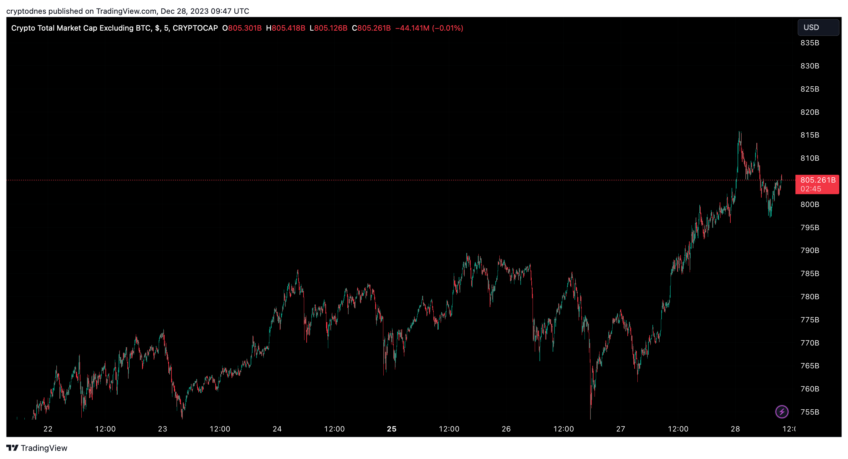 Междувременно все още на писане на публикацията показателят Total Crypto Market Cap 2 (всички алткойни, без Биткойн ) се увеличи до $805.261 милиарда, макар че малко по-рано отчиташе $815 милиарда, което се смята за годишен връх.