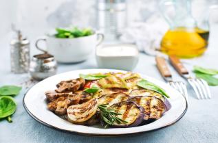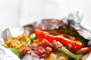 Зеленчуците се овкусяват със зехтина, оцета, сол, ригана и черен пипер. Разбъркват се. Разпределят се върху 4 листа алуминиево фолио 2 в 1. Завиват се стегнати пакети.